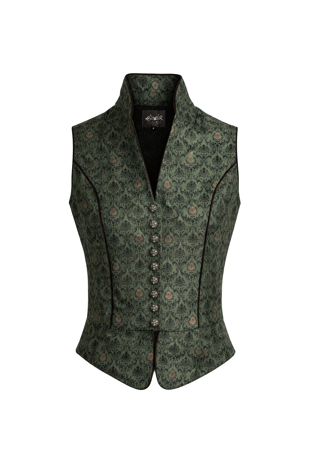 Dieses fesch designte Trachtenweste von Hangowear ist ein absoluter Hingucker. Mit der Farbe dunkelgrün lässt es sich perfekt zur Lederhose, Jeans oder zum Trachtenrock kombinieren.